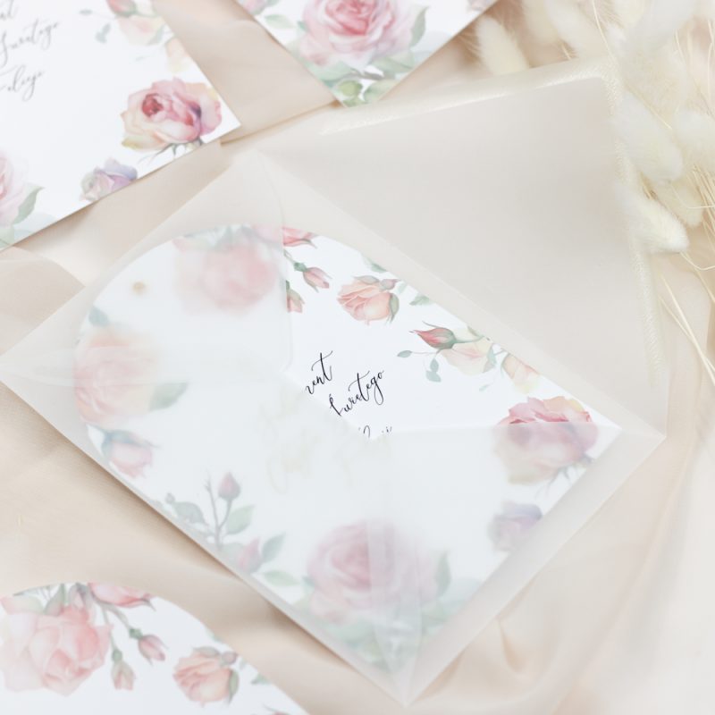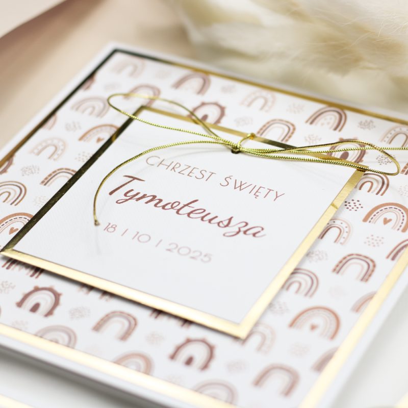 Zaproszenie “KARMEL” zachwyca delikatnymi odcieniami złota, beżu i brązu. Główną ozdobą jest uroczy motyw tęczy. Dopełnieniem całości jest złota kokardka – mały, ale stylowy akcent!